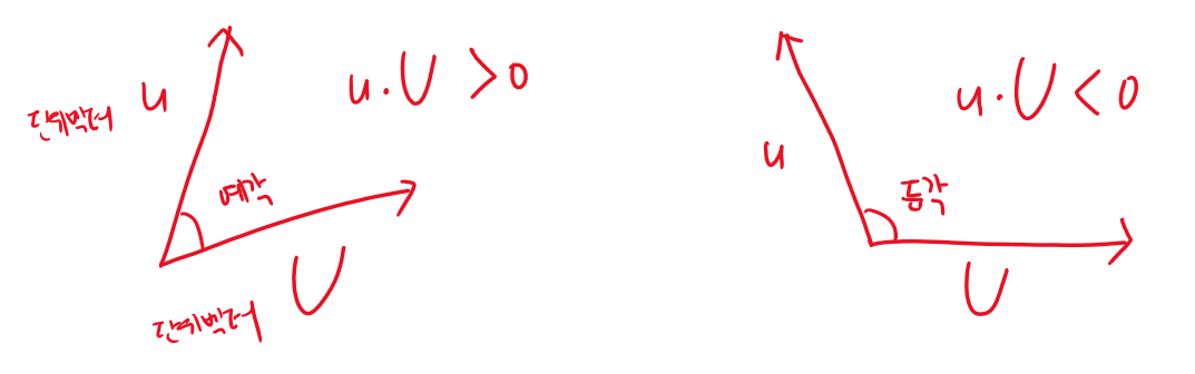 우리는 아까 두 벡터의 접곰이 0이면 서로 수직(90도)이라는 것에 대해 살펴봤습니다. 그렇다면 만약 접곰이 음수가 나오거나 양수가 나올 때는 어떤 기하학적 의미를 갖고 있을까요? 지금은 각도가 중요한 상황이니 두 개의 단위벡터를 가지고 생각해보겠습니다.