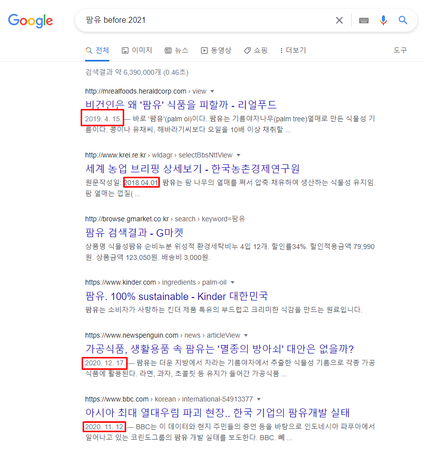 위와 같이 검색하면 2022년 이후에 쓰여진 "팜유"와 관련된 글만 검색됩니다. 2021년을 포함하지 않습니다. 코딩뿐만 아니라 주식과 관련된 정보를 검색할 때는 최신 뉴스를 보는 것이 생명이겠죠?