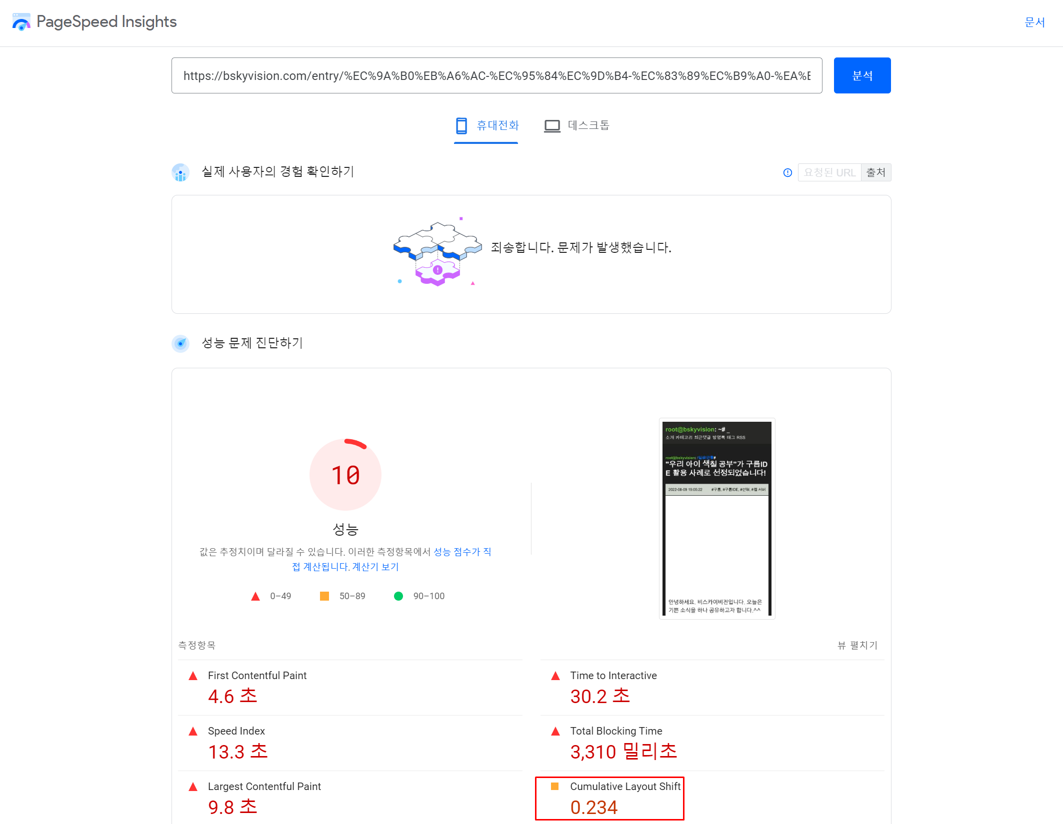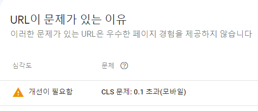 보고서를 열어보니 "CLS 문제: 0.1 초과"가 문제라고 명시되어 있습니다.