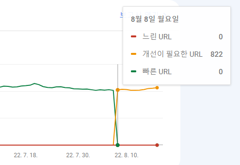 저는 제 블로그에 구글 서치 콘솔을 연동해서 사용하고 있습니다. 한 달에 두 세번씩 구글 서치 콘솔을 종종 들어가보곤 하는데, 최근에 구글 서치 콘솔에서 확인한 결과 2022년 8월 8일을 기점으로 제 블로그에서 "개선이 필요한 URL"이 갑자기 많아졌다는 것을 알게 되었습니다. 원래는 대부분의 페이지가 "빠른 URL"이었는데, 갑자기 8월 8일부터 거의 모든 URL이 "개선이 필요한 URL"이라는 평가를 받았습니다. 모바일과 데스크톱 환경 모두에서요.