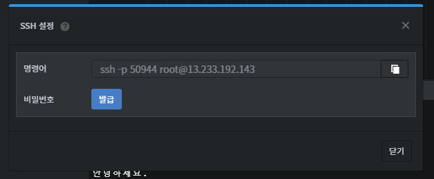 [발급] 버튼을 클릭하여 얻은 비밀번호로 SSH 접속을 시도하면 됩니다.
