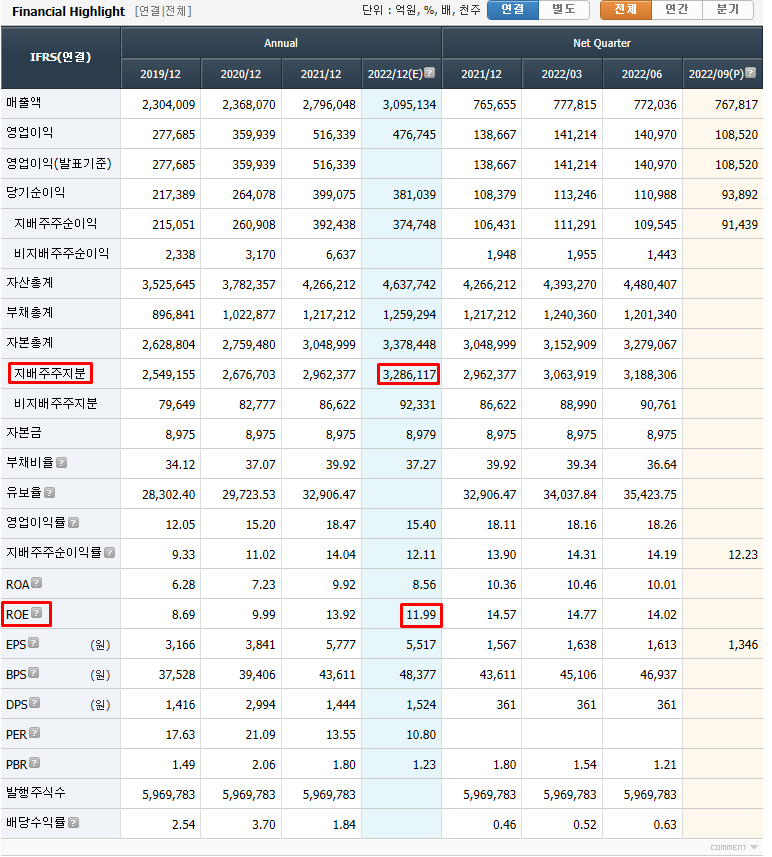 참고로 키움증권의 HTS를 통해 지배주주지분, ROE, 발행주식수를 확인했습니다. 발행주식수는 보통주와 우선주를 모두 합한 것으로 계산했습니다. 그리고 요구수익율은 BBB- 등급 채권의 5년 수익률인 11.61%로 정했습니다.