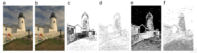 아래 그림은 4개의 부분으로 분류한 예를 보여준다. a는 원본 이미지, b는 왜곡 이미지, c는 보존된 엣지 부분, d는 변화된 엣지 부분, e는 평탄 부분, f는 질감 부분이다. 검은 부분이 그 부분들을 나타낸다.