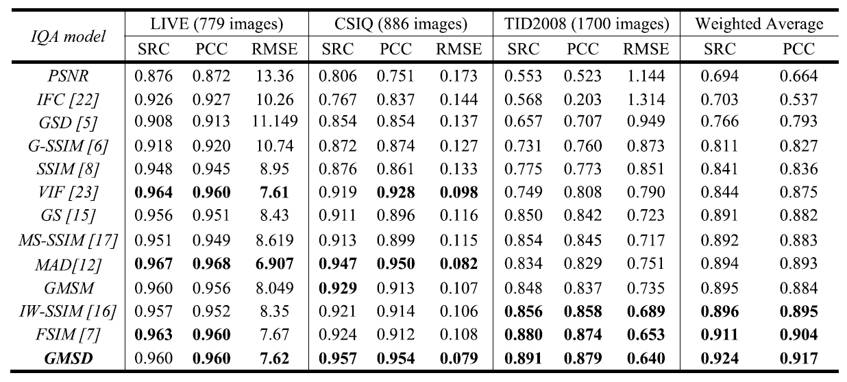 자, 그러면 GMSD의 성능을 3개의 IQA 데이터베이스에서 테스트한 결과를 살펴보겠습니다.