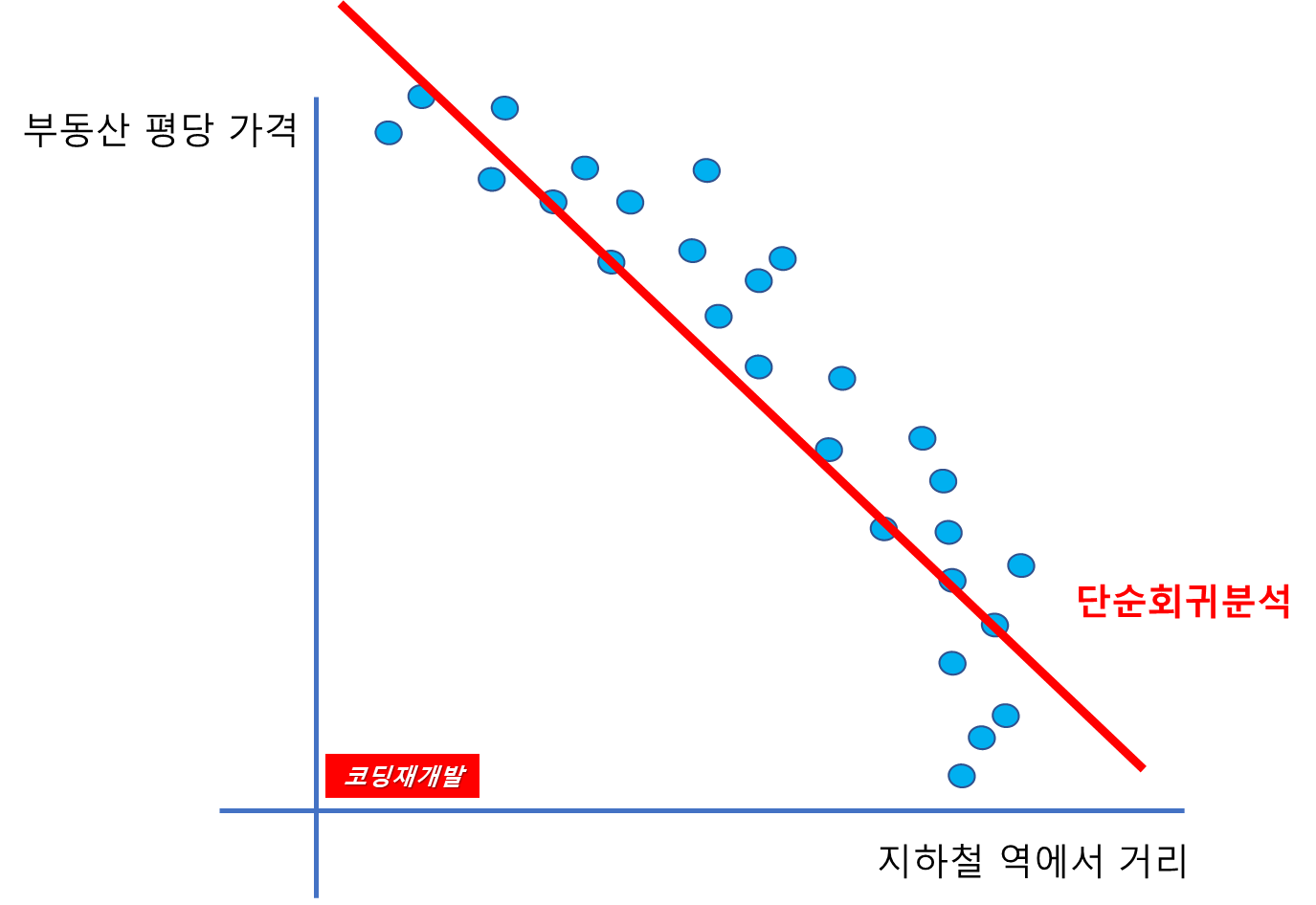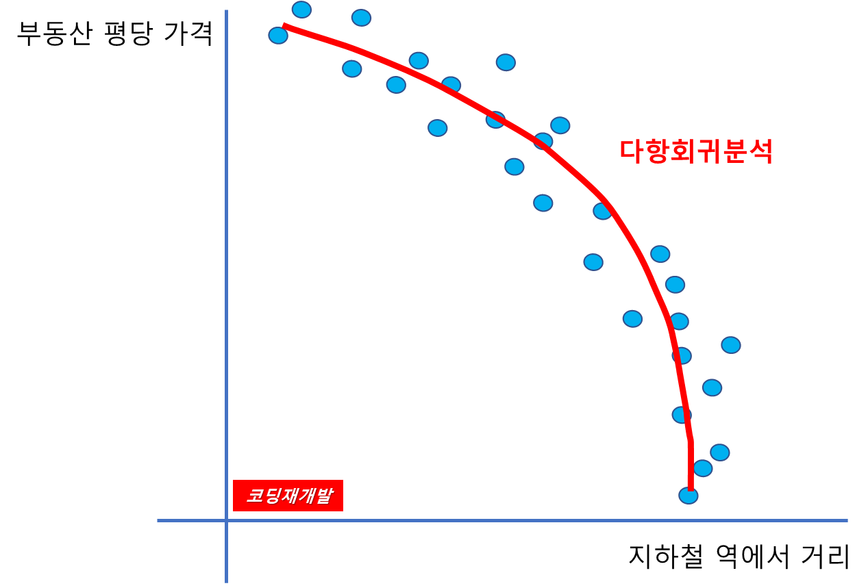 지하철 역에서 거리라는 특성(변수)를 가지고 부동산 평당 가격을 예측하고 싶다면 회귀분석이 필요합니다.