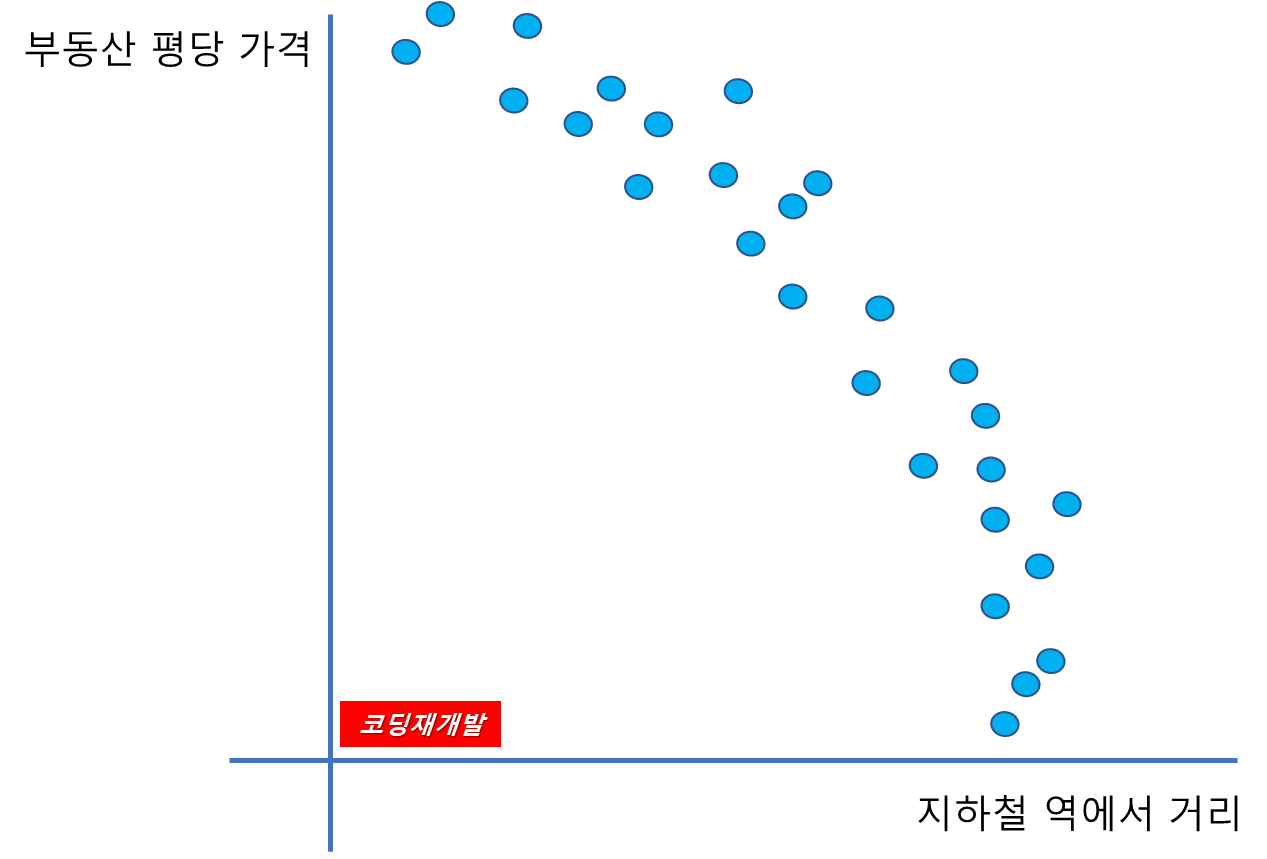 산점도를 그렸을 때 다음과 같은 분포를 나타내는 데이터가 있다고 가정해보겠습니다. x축은 지하철 역으로부터의 거리이고, y축은 부동산 평당 가격이라고 하겠습니다. 역에 가까울 수록 집값이 비싸다는 데이터입니다.