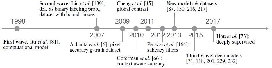 두번째 사건은 2007년에 Liu 등이 visual saliency 과제를 이진 분할 문제(back ground와 foreground)로 정의한 것이다. visual saliency 과제를 object detection의 관점으로 보기 시작한 것이다.