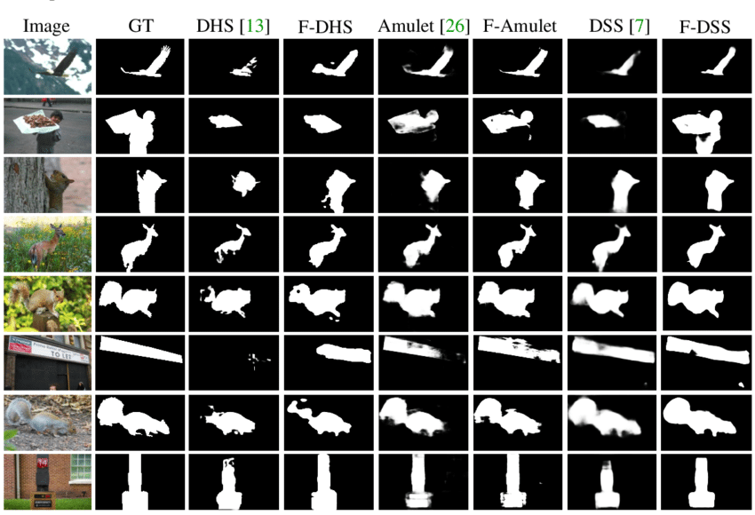 SOD의 목적은 이미지 내에서 중요하다고 생각되는 물체를 검출해내는 것이다. 다른 말로 배경(background)에서 중요한 전경(foreground) 물체만을 분할해낸다. 아래 그림은 몇 개의 이미지에 대해 여러 개의 SOD 알고리즘들이 적용되어 산출된 saliency 맵들을 보여준다. SOD 알고리즘들이 배경과 중요한 전경 물체를 어느 정도 잘 분할해내는 것들을 확인할 수 있다. GT, 즉 ground-truth와 비교해서 F-DDS 모델이 산출한 saliency 맵은 큰 차이가 없다.