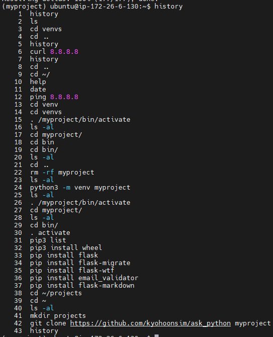어떤 명령은 매우 길게 작성해야하기도 합니다. 그때마다 키보드에서 윗 방향키를 눌러가면서 최근 수행한 명령어를 찾을 수도 있겠지만, 몇 개의 명령을 그 사이에 수행했다면 찾는데 시간이 걸립니다. 이런 경우에는 history 명령어를 사용하는 것이 좋습니다.