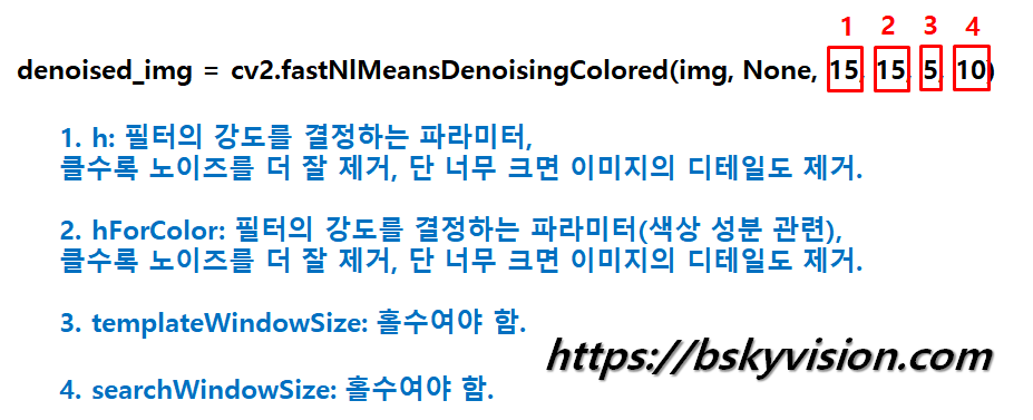 컬러이미지에서 노이즈를 제거하는 경우 사용자가 설정해줘야할 파라미터가 4개가 있습니다. 그 4개 값을 적절히 설정해주면 됩니다. 그러면 위 코드를 실행해보겠습니다.