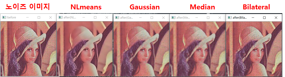 보시다시피 NLmeans는 꽤 노이즈를 잘 제거해냄을 알 수 있습니다. 물론 이미지에서 지워지지 말아야할 디테일한 부분들도 지워지긴 했지만요. 동일한 이미지에 대해 Gaussian, Median, Bilateral 필터를 적용하면 어떤 결과가 나오는지도 확인해보겠습니다. 사용한 파이썬 코드와 실행 결과는 각각 다음과 같습니다.