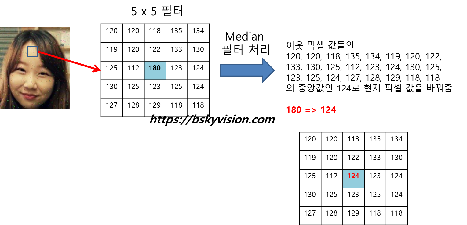 가장 간단하게 이미지에서 노이즈를 제거하는 방법은 예전에 소개해드렸던 Gaussian 필터, Median 필터, Bilateral 필터를 사용하는 것입니다. Gaussian, Median, Bilateral 필터 처리는 모두 이웃한 주변 픽셀들의 값을 가지고 현재 픽셀의 값을 바꿔준다는 특징을 갖고 있습니다. 예를 들어, Median 필터는 현재 픽셀의 주변 이웃들의 중앙값(median)을 구해서 그것을 현재 픽셀의 값으로 삼아줍니다.