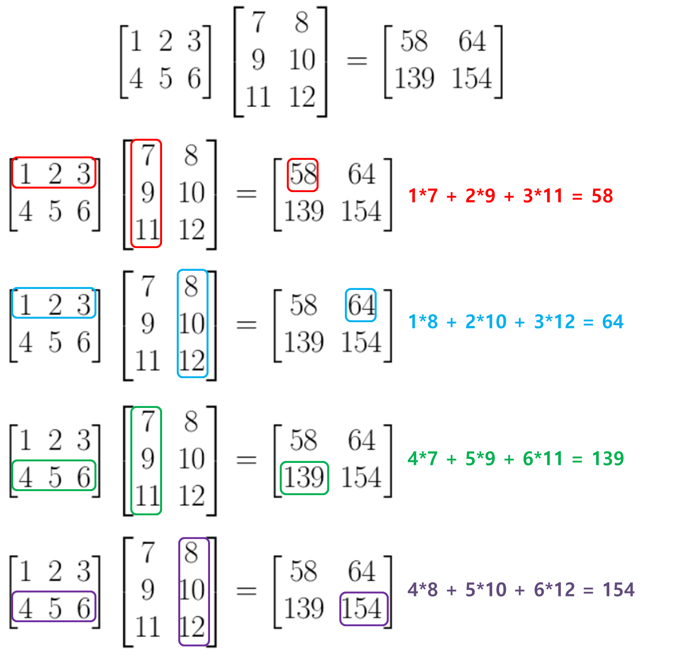 "행렬A와 행렬B를 곱한 결과 생성된 행렬AB의 (i, j) 요소는 행렬A의 i번째 행(row)과 행렬B의 j번째 열(column)을 곱한 것이다."