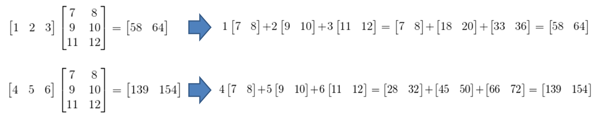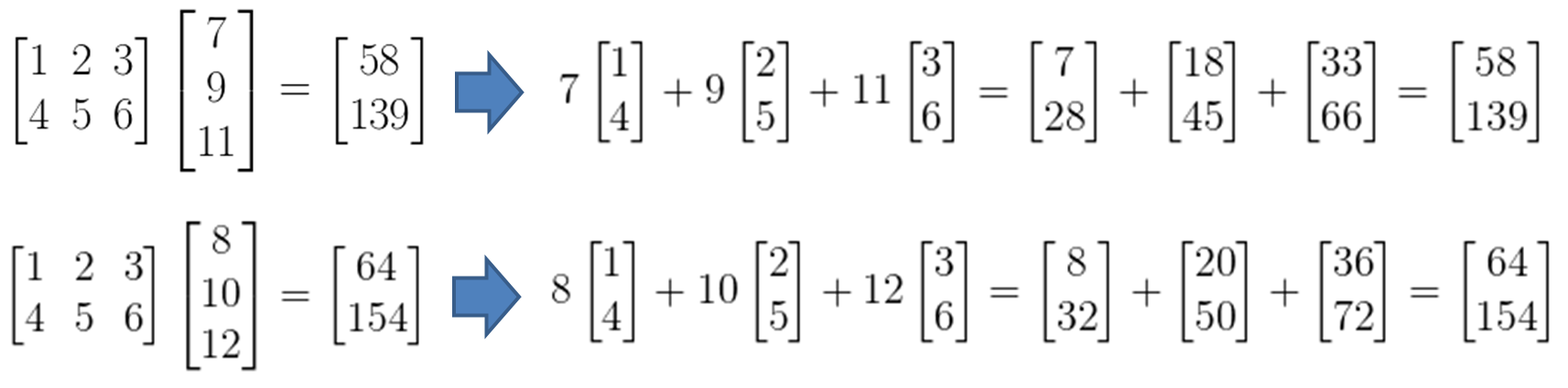 세가지 관점을 요약해보자. 첫번째 관점은 행렬A와 행렬B의 곱 행렬AB를 구할 때 한번에 하나의 요소를 계산해주고, 두번째 관점은 한번에 하나의 열을 계산해주고, 세번째 관점은 한번에 하나의 행을 계산해준다.