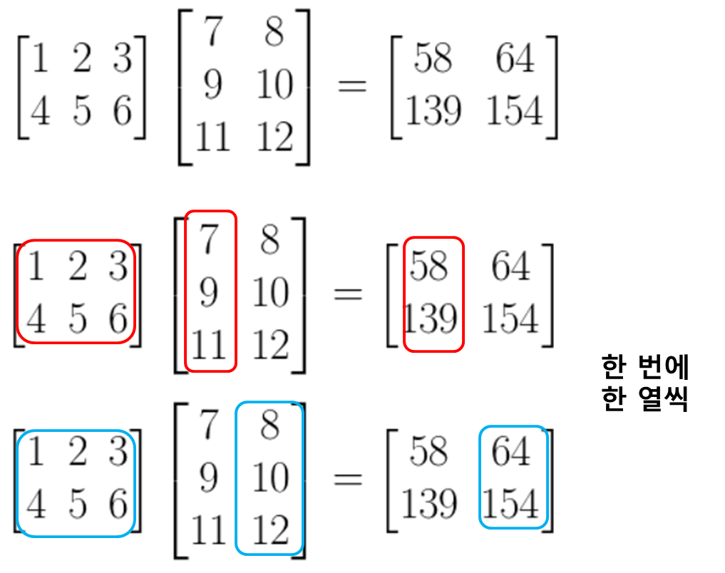 "행렬A와 행렬B를 곱한 결과 생성된 행렬AB의 j번째 열은 행렬A에 행렬B의 j번째 열을 곱해준 것이다."