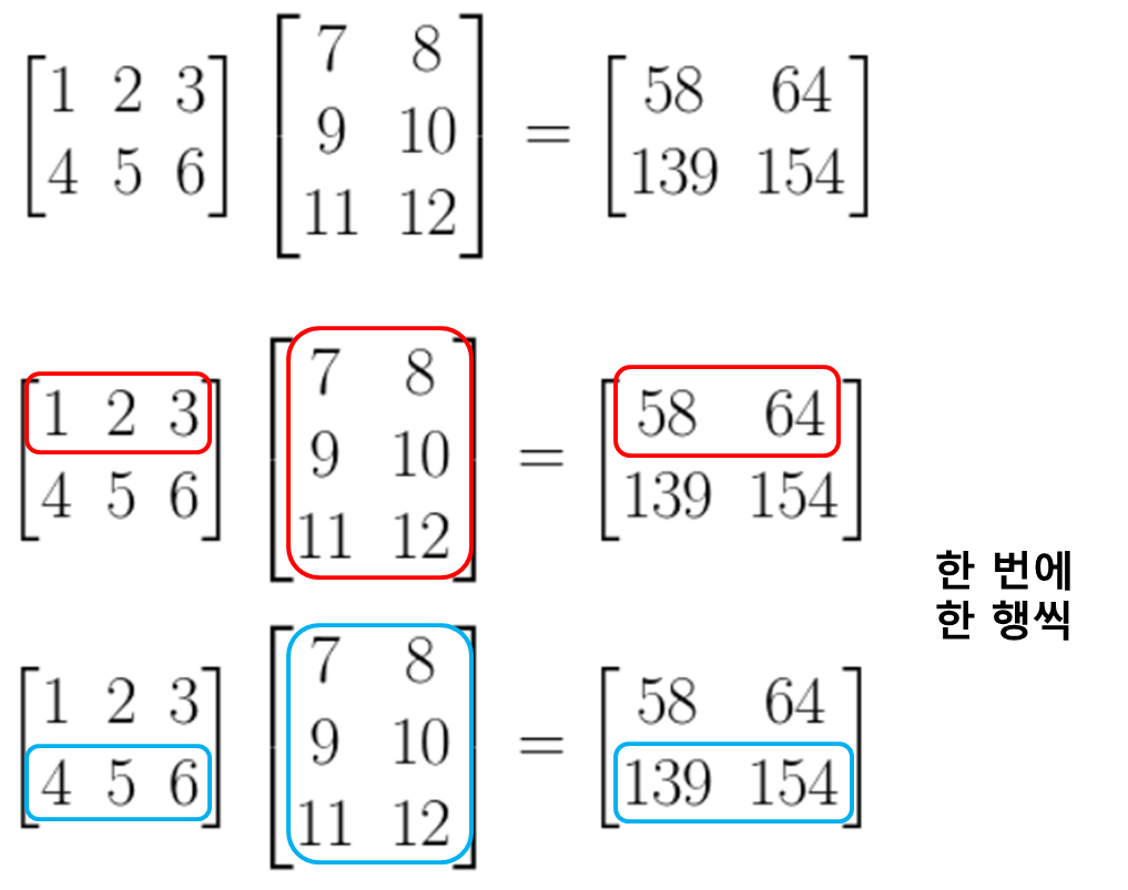"행렬A와 행렬B를 곱한 결과 생성된 행렬AB의 i번째 행은 행렬A의 i번째 행에 행렬B를 곱해준 것이다."