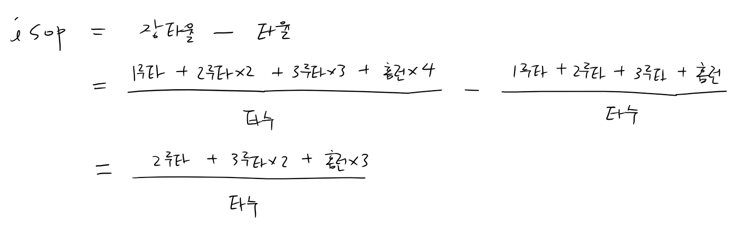 isop = (2루타갯수 + 3루타갯수*2 + 홈런갯수*3) / 타수