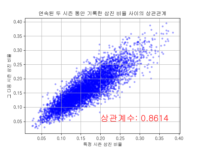연속된 두 시즌의 삼진 비율 사이의 상관관계