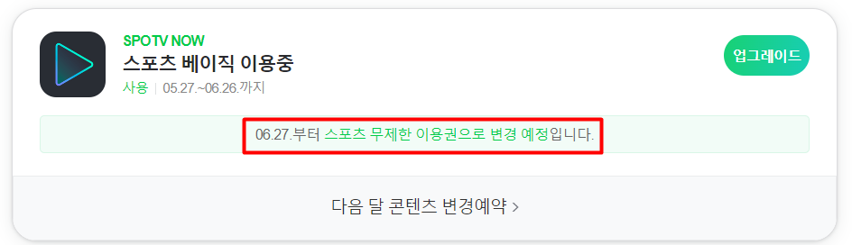 옵션 중에서 스포츠 무제한(무료)를 클릭하시면 됩니다. 그러면 더 이상 라이브 중계를 볼 수 없습니다. 즉, 손흥민 선수 경기를 실시간으로 볼 수 없다는 뜻입니다. 정상적으로 반영되었다면 아래와 같은 화면이 뜹니다.