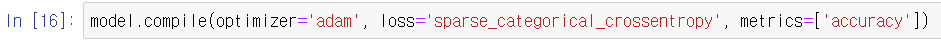 그 다음에는 어떤 방식으로 모델을 훈련시킬 것인가를 설정해줍니다. adam이란 최적화 방법과 sparse categorical crossentropy 손실 함수(목적 함수)로 설정해줬습니다.