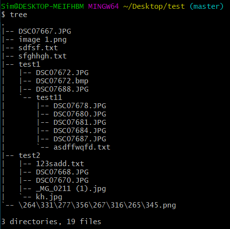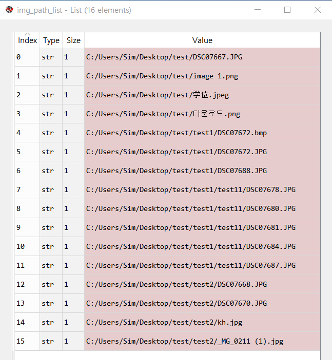 위 코드를 실행하면, 바탕화면에 있는 test 디렉토리(C:\Users\Sim\Desktop\test) 내에 존재하는 모든 이미지 파일들의 경로를 리스트의 형태로 얻을 수 있습니다. 참고로 test 디렉토리 내부는 다음과 같은 트리 구조를 갖고 있습니다.