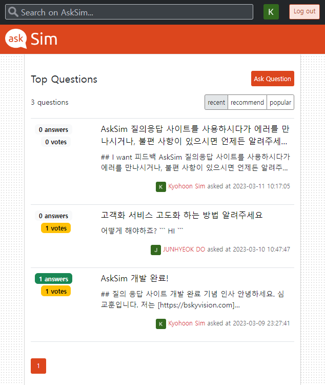 사이트 이름은 AskSim입니다. "심교훈에게 물어봐"입니다. 물론 다른 분들이 답변을 주실 수도 있습니다. ㅎㅎ
