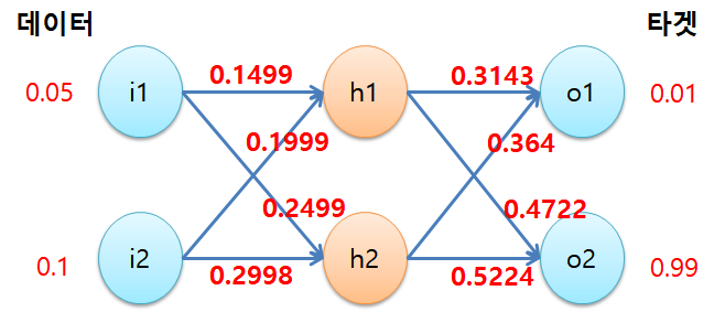 드디어 모든 가중치를 한번씩 업데이트 시켰습니다. 여기까지도 읽어내려오신 분들의 끈기에 박수를 드립니다. 이제 업데이트된 가중치를 가진 네트워크에 다시 훈련 데이터를 통과시켜보겠습니다. 오차가 줄어들었는지 확인해봅시다.