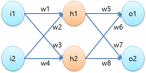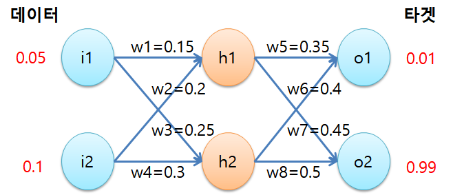 w1, w2, w3,...,w8 까지 총 8개의 가중치(weight)가 훈련되어야합니다. 문제를 단순화시키기 위해 편향(bias)은 포함시키지 않았습니다. 단 하나의 훈련 데이터 샘플로 이 네트워크를 훈련시켜보겠습니다. 그 샘플은 (0.05, 0.1)이고 타겟값은 (0.01, 0.99)입니다. 그리고 가중치들은 다음과 같이 초기화시켜주겠습니다.