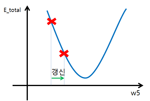 $E_{total}$ 함수의 최소값은 각 가중치로 편미분했을 때 0이 되는 지점일 것입니다. 만약 현재의 가중치가 그 최소값을 갖게하는 위치에서 왼쪽에 있다면 오른쪽으로 가도록 보정하면 되는 것이고, 오른쪽에 있다면 왼쪽으로 가도록 보정하면 되는 것이죠. 아래 그림을 참고하세요(설명을 위해 8차원의 그래프를 2차원의 그래프로 단순화시켜서 그렸습니다).