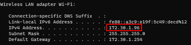 2) 공인 IP 주소를 통해 공유기까지 찾아왔다면 이제 사설 IP가 필요하다. 그래야 그 공유기에 붙어있는 여러 기기 중 하나를 특정해서 접근할 수 있다. 현재 내 노트북의 사설 IP 주소는 172.30.1.96이다. 윈도우 pc에서 cmd를 열고 ipconfig 명령어를 입력하면 사설 IP 주소를 확인할 수 있다.