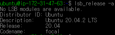 그러면 위와 같이 버전이 나옵니다. 제가 사용하고 있는 AWS EC2 가상머신은 우분투 20.04.2 LTS 버전이네요.