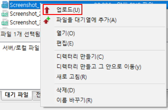 4. 좌측 로컬 사이트에서 보내고자 하는 파일을 우클릭하면, 메뉴 중에 업로드가 있는데 그것을 클릭하시면 리모트 사이트의 해당 경로로 전송됩니다.