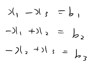 이 친구는 뭔가 연립해서 푸려고 하면 잘 안 풀립니다. 뭔가 하나의 변수가 소거가 되어야 풀리는데, 어떻게 해도 하나만은 소거가 안됩니다. 왜냐하면 좌변을 모두 더해보면 0이 되고, 우변을 모두 더해보면 b1+b2+b3가 되기 때문입니다.