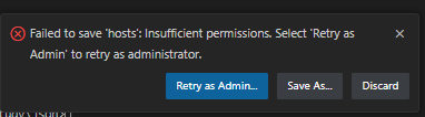 그런데 만약 권한 문제로 수정할 수 없다는 등의 경고창이 뜨고 수정이 되지 않는다면, vscode에서 hosts 파일을 연 후에 수정한 후에 저장을 하면, 우측 하단에 다음과 같은 창이 뜰 텐데, 이때 Retry as Admin 버튼을 누르면 반영이 될 것입니다.