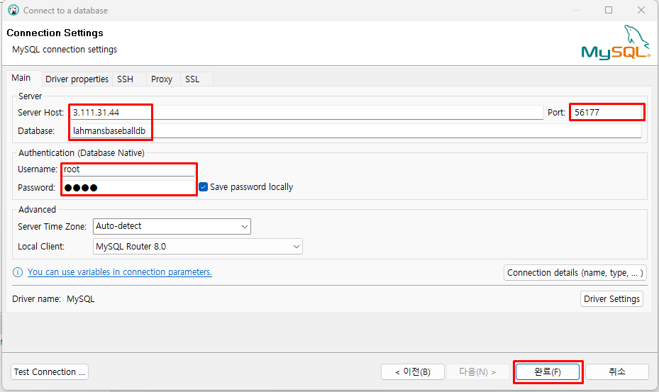 7) Server Host, Port, Username, Password 등의 접속 정보를 기입합니다.