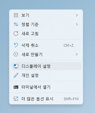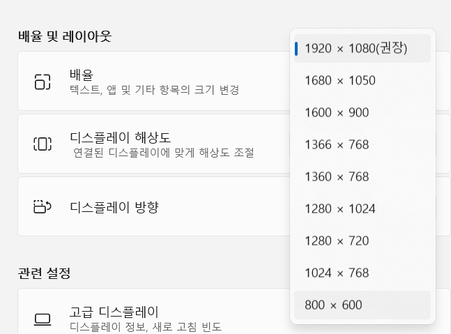 바탕화면에서 오른쪽 클릭하신 후 뜨는 메뉴에서 디스플레이 설정 화면을 클릭해서 들어가시면 아래와 같이 디스플레이 해상도를 변경할 수 있습니다. 정상적인 상황이라면 그렇습니다.
