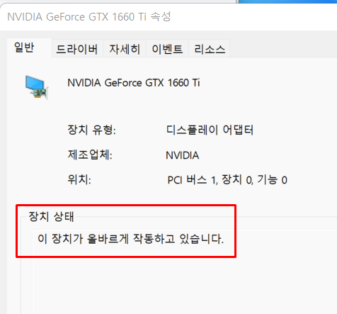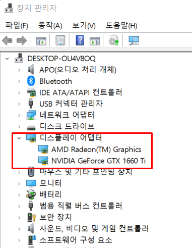 장치 관리자에서 디스플레이 어댑터를 클릭해서 내장 그래픽과 외장 그래픽이 정상적으로 실행되고 있는지 확인합니다. 참고로 제가 사용하고 있는 노트북에는 내장 그래픽 카드 AMD Radeon(TM) Graphics와 외장 그래픽 카드 NVIDIA GeForce GTX 1660 Ti가 설치되어 있습니다.