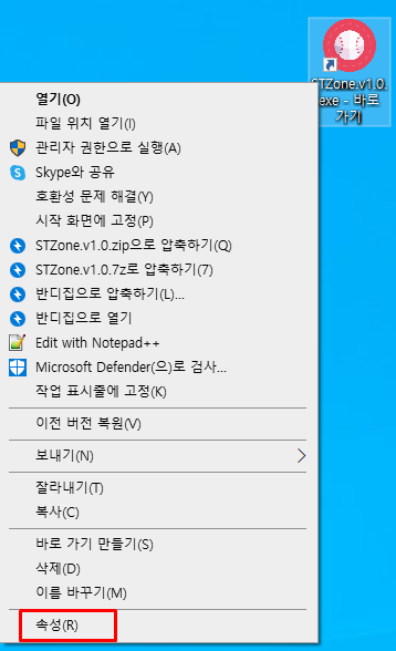 1. 바로 가기 아이콘을 오른쪽 클릭한 후 속성을 클릭합니다.