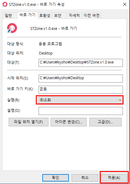 3. 실행(R)을 "최소화"로 세팅하신 후에 적용 버튼을 클릭하시면 됩니다.
