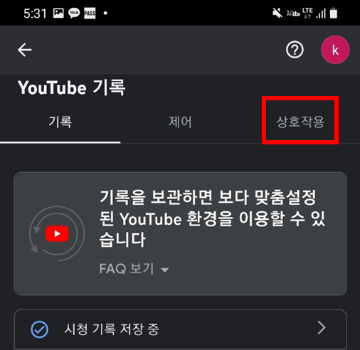 6. YouTube 기록 페이지에서 "상호작용" 탭을 클릭합니다.
