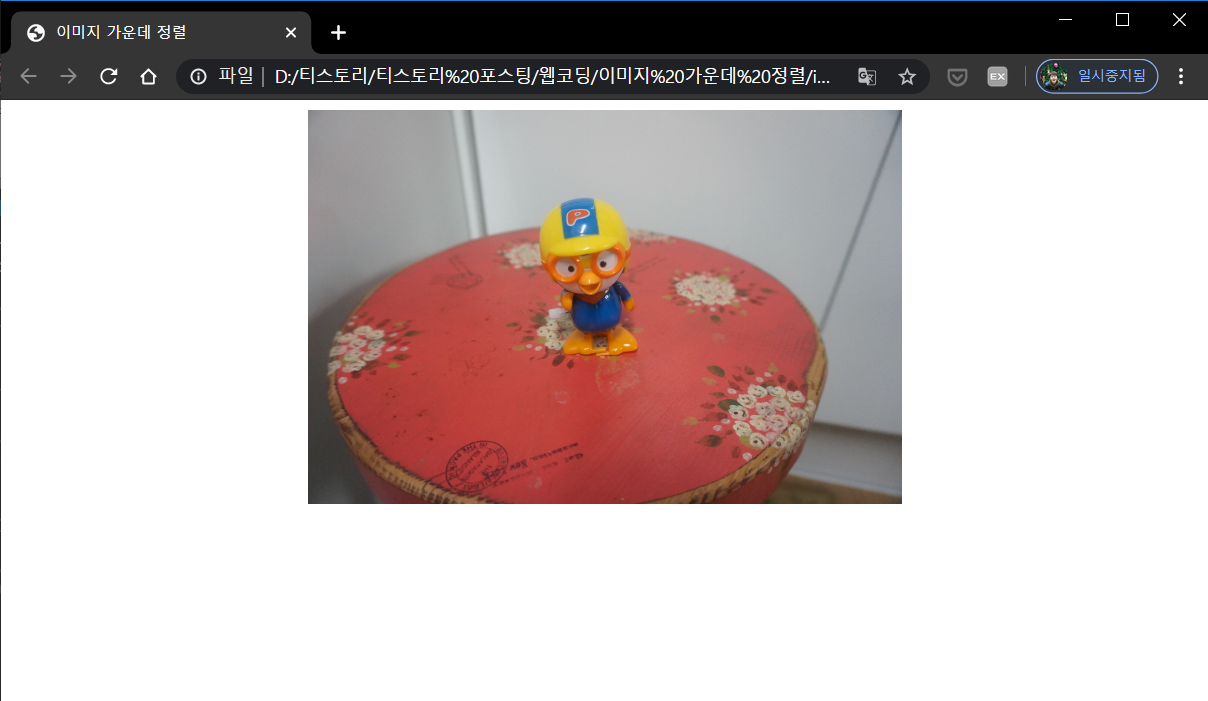 이 html 코드를 다음과 같은 css 코드로 꾸며주면 이미지가 가운데에 위치하게 됩니다.
