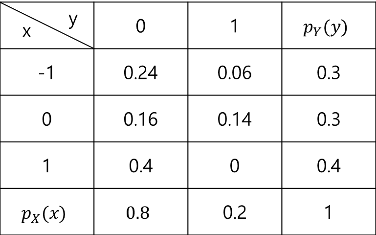 을 먼저 구해야 한다. 결합확률분포표가 주어졌을 때는 가장 오른쪽 열과 가장 아래쪽 열에 있는 주변확률분포들