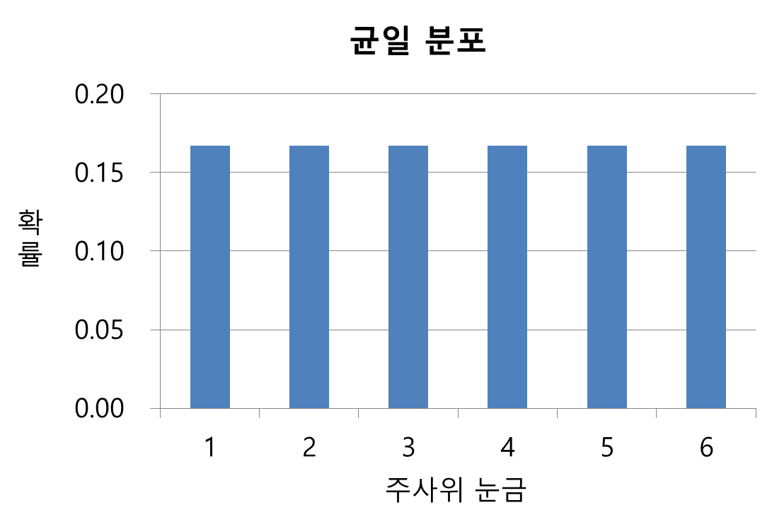 방금 예시로 든 주사위 한 개를 던져서 각 눈이 나올 확률은 모두 1/6로 균일합니다. 이러한 확률 분포를 균일 분포(uniform distribution)라고 부릅니다.