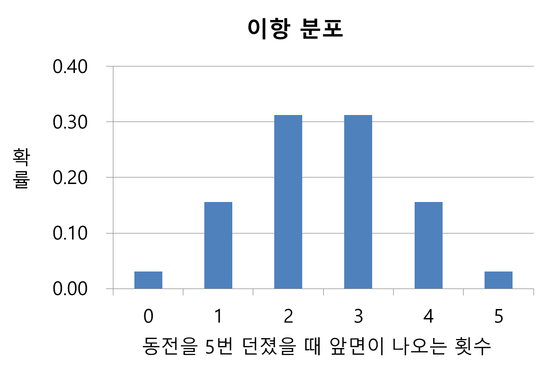 동전을 5번 던져서 2번 앞면이 나올 확률은 얼마일까요? 이렇게 두 가지 경우의 수밖에 없는 시행을 반복할 때 나올 수 있는 값의 확률 분포를 나타내는 것이 이항 분포(binomial distribution)입니다.