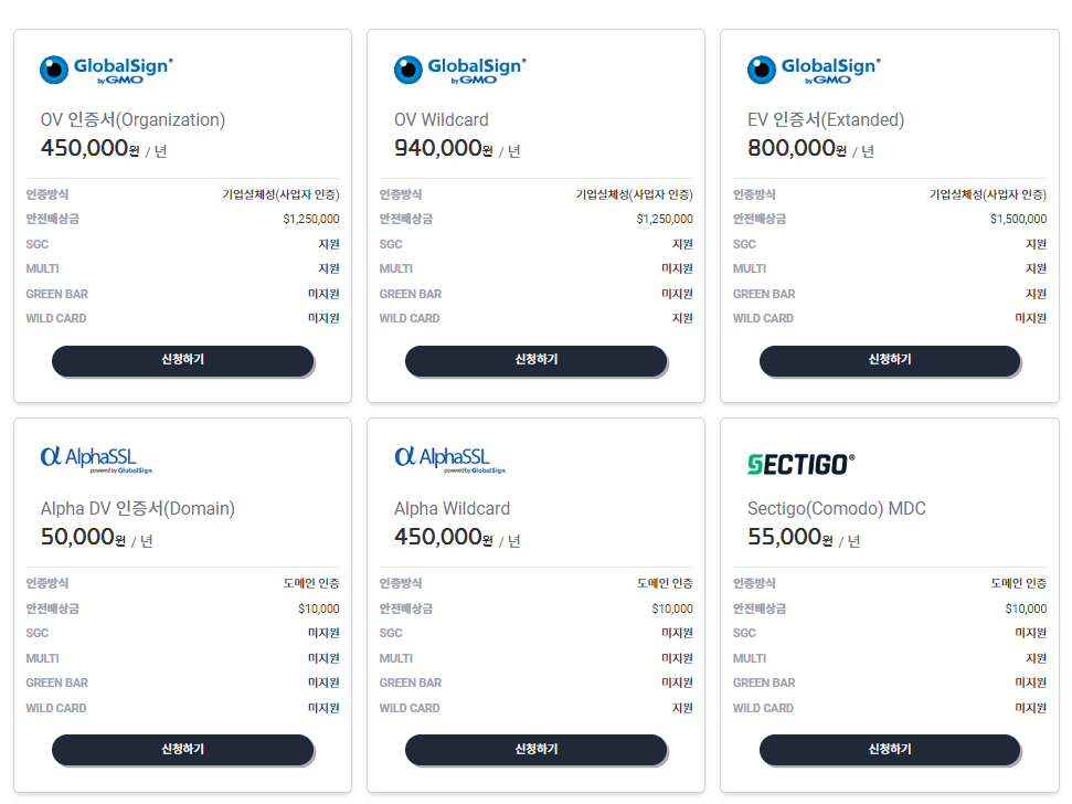 다양한 SSL 인증서가 있는데, 이 중에서 저는 가장 저렴한 Alpha DV 인증서를 신청해서 사용했습니다. 부가세 포함하면 1년에 55,000원입니다. 인증서에 따라 보안의 정도가 다르다고 합니다. 호스트센터 쪽에 문의를 해보면 현재 자신에 상황에 맞는 인증서를 선택하시는데 도움을 줄 것입니다.