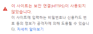 클릭해보면, "보안 연결(HTTPS)이 사용되지 않았습니다"라고 되어 있습니다.