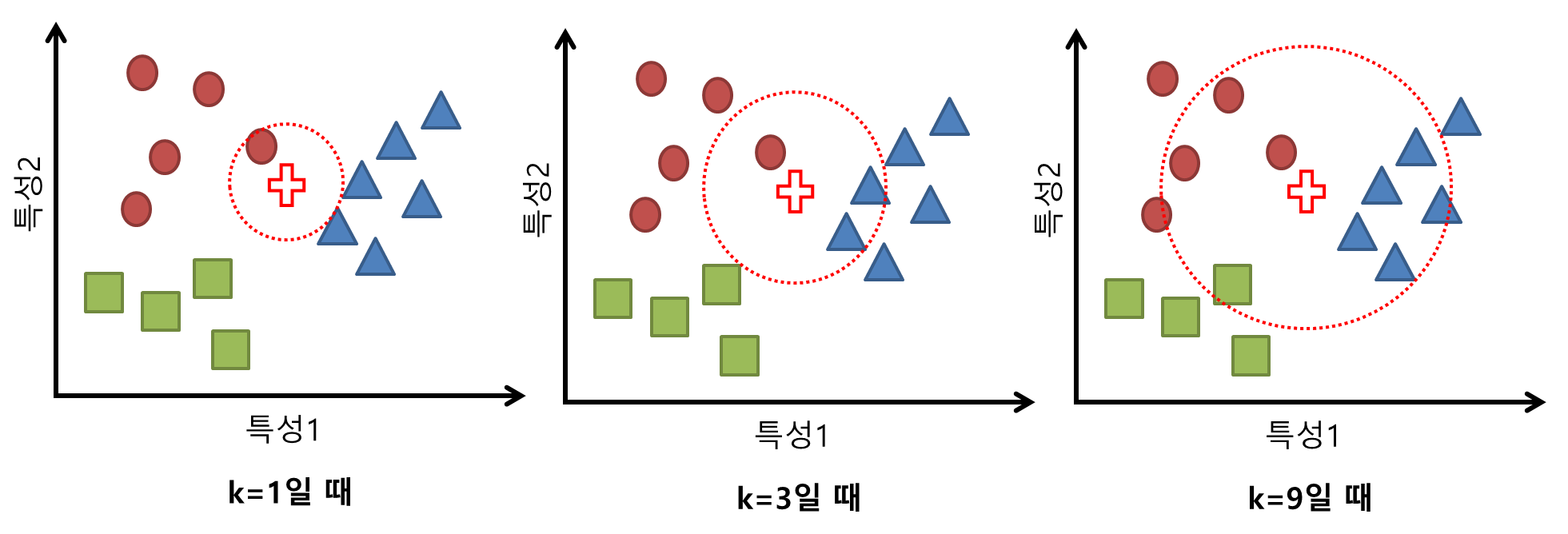 k=1일 때를 살펴보면 테스트 데이터에서 가장 가까운 학습 데이터는 동그라미 클래스에 속함을 알 수 있다. 따라서 테스트 데이터의 클래스를 동그라미 클래스로 정해준다. k=3일 때를 보면, 3개의 가장 가까운 이웃 중 과반수가 넘는 2개가 세모 클래스임을 알 수 있다. 따라서 이때는 테스트 데이터의 클래스를 세모 클래스로 정해준다. k=9일 때는 9개의 가장 가까운 이웃 중 5개가 세모 클래스에 속함을 확인할 수 있다. 따라서 테스트 데이터의 클래스는 세모가 된다.