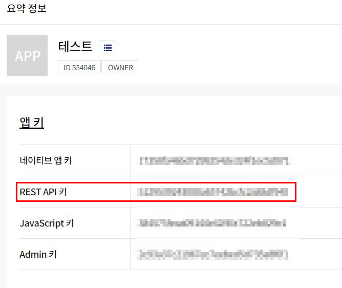 위 코드를 그대로 복사해서 붙여넣으시면 실행이 제대로 안 될 것입니다. 실행이 되게 하려면 REST API KEY가 필요합니다. 카카오 앱 키의 REST API KEY를 얻는 방법은 다음과 같습니다.