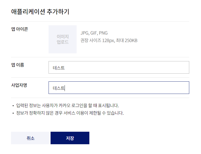 그 다음에 [애플리케이션 추가하기]를 누르신 후, 앱 이름과 사업자명에 각각 테스트라고 기입합니다. 다른 이름을 기입하셔도 좋습니다.