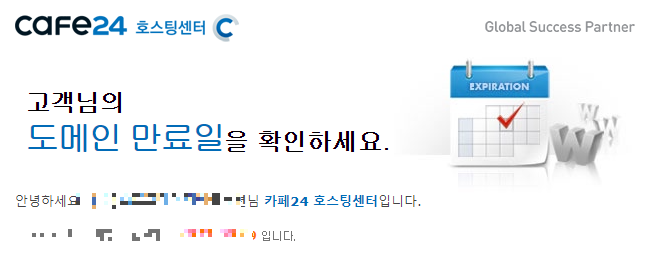 혹시 카페24로부터 "도메인 만료일이 30일 남았습니다"라는 이메일을 받으셨다면, 도메인 연장 신청을 해주셔야 합니다. 물론 더 이상 사용하지 않는 도메인이라면 메일을 그냥 무시하시면 됩니다.